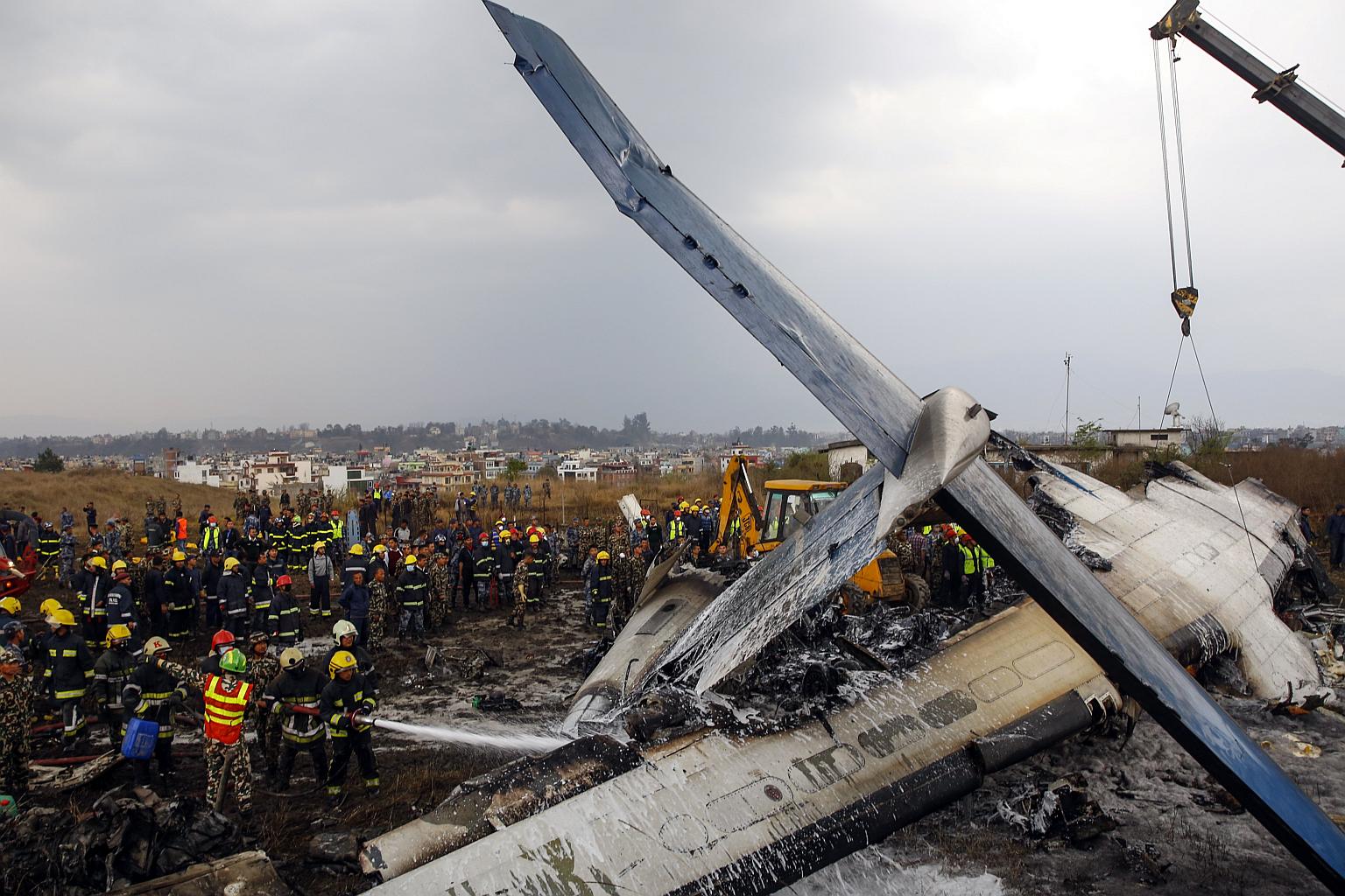 Rescue teams next to a wreckage of a plane that crashed at the main airport Tribhuvan International Airport in Kathmandu, Nepal, on March 12, 2018.