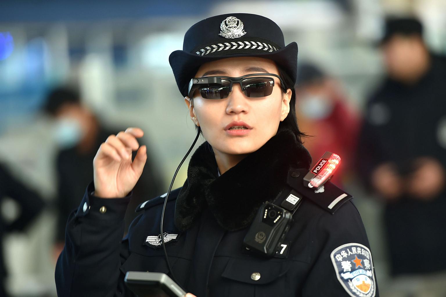 A police officer wearing a pair of smartglasses with a facial recognition system at Zhengzhou East Railway Station, in China's central Henan province.
