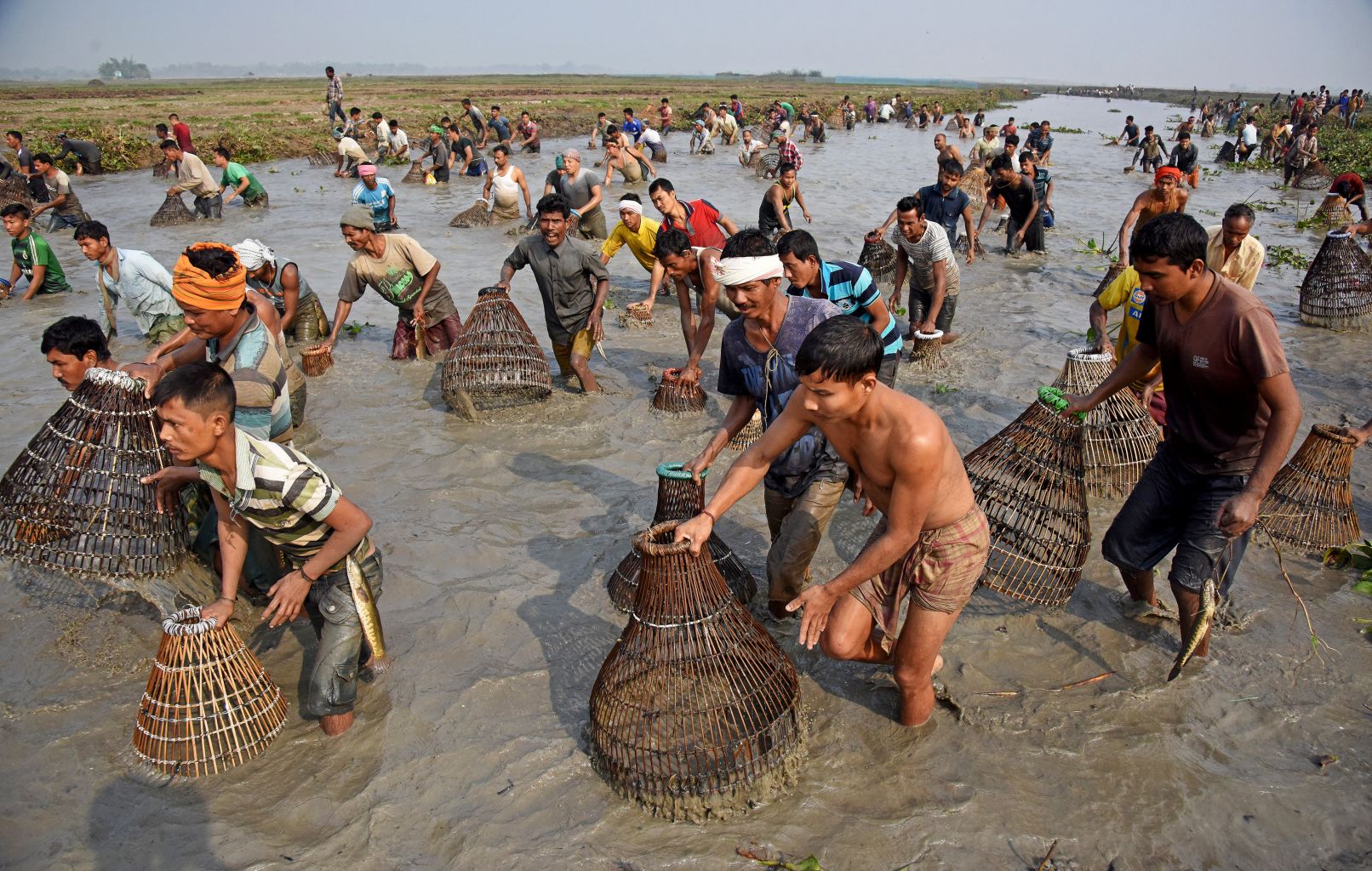 People belonging to the Tiwa tribe at a community fishing event as part of celebrations for the harvest festival of Assam, in Morigaon district, in the north-eastern state of Assam, India, on Jan 16, 2018.