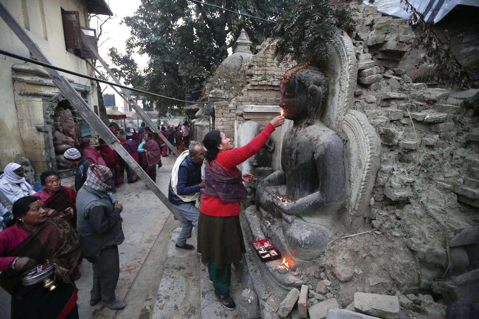 A Nepalese woman worshipping a partially destroyed statue of Lord Buddha in Bhaktapur, on the outskirts of Kathmandu, on Jan 24, 2016.