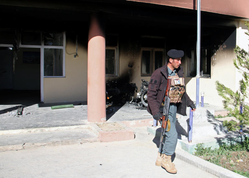 An Afghan policeman walks at the government district building after a Taleban attack in Khawaja Omari district of Ghazni province, Afghanistan, on April 12, 2018.