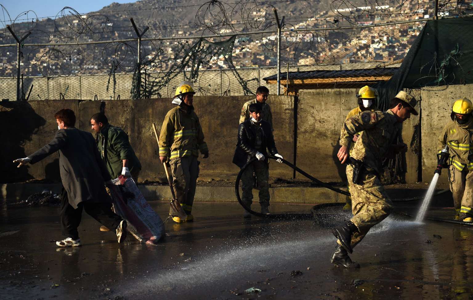 Afghan firefighter wash the site after a suicide attacker detonated himself at the entrance to a police base in Kabul on Feb 1, 2016.