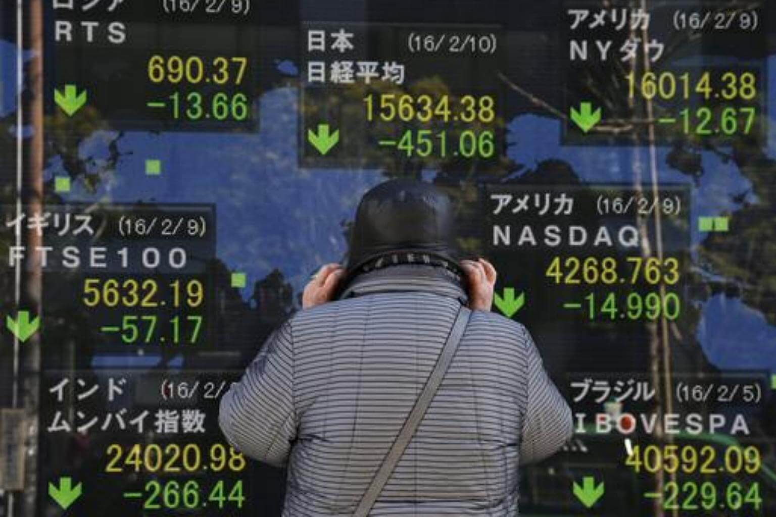 A pedestrian gazes at information of Tokyo's Nikkei Stock Average during an afternoon trade session and other global markets in Tokyo.