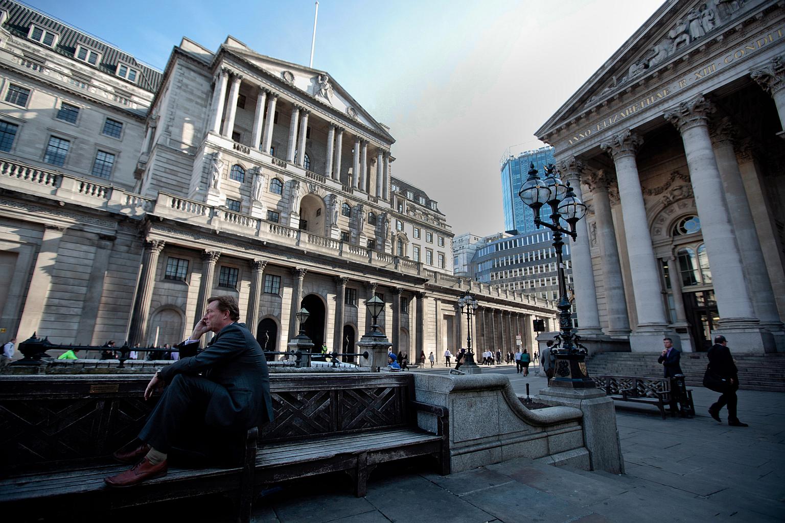 A businessman speaks on a mobile phone while sitting on a street bench outside the Royal Exchange (right), and Bank of England (left), in London.
