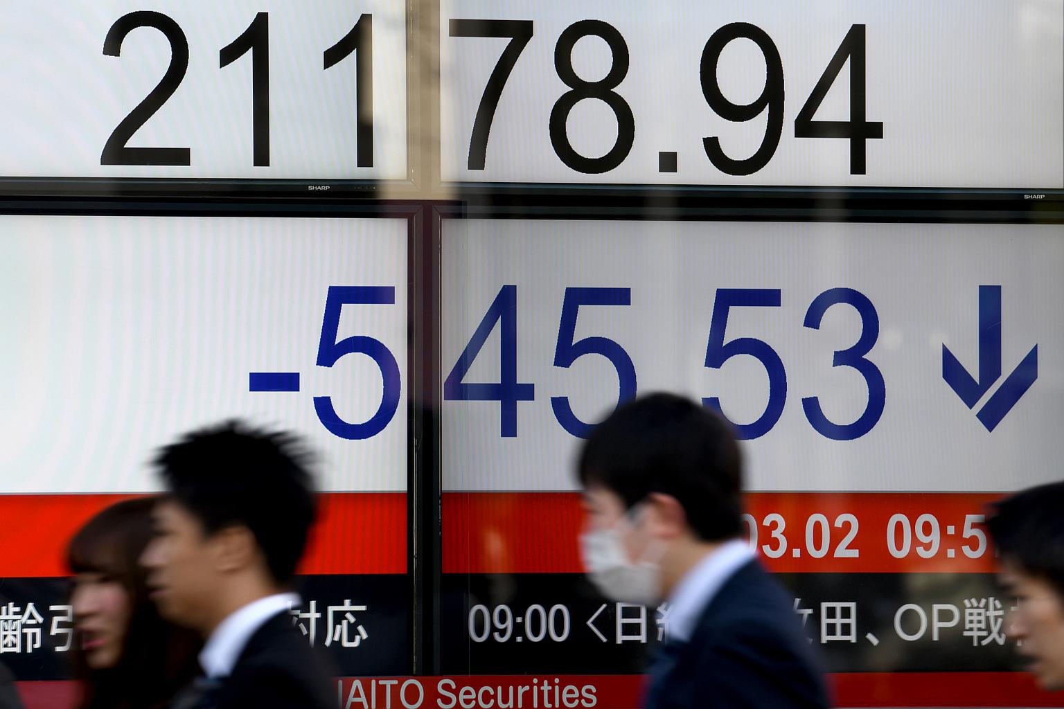 Pedestrians walking past the electronics stock indicator at the window of a security company in Tokyo.