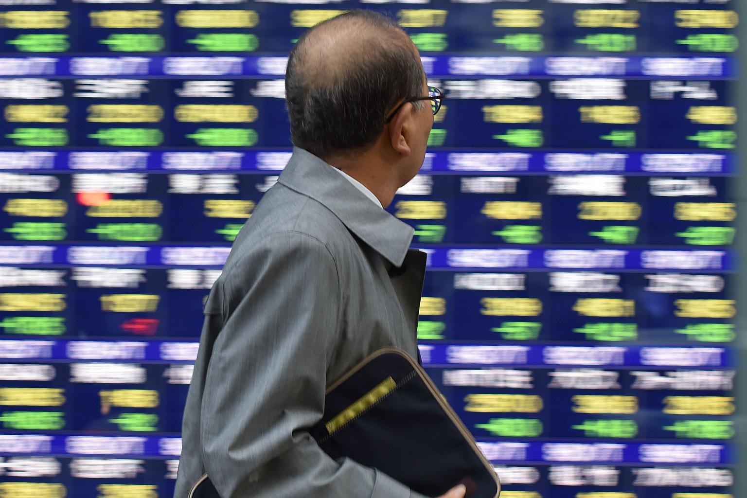 A pedestrian looks at a quotation board flashing the Nikkei key index from the Tokyo Stock Exchange.