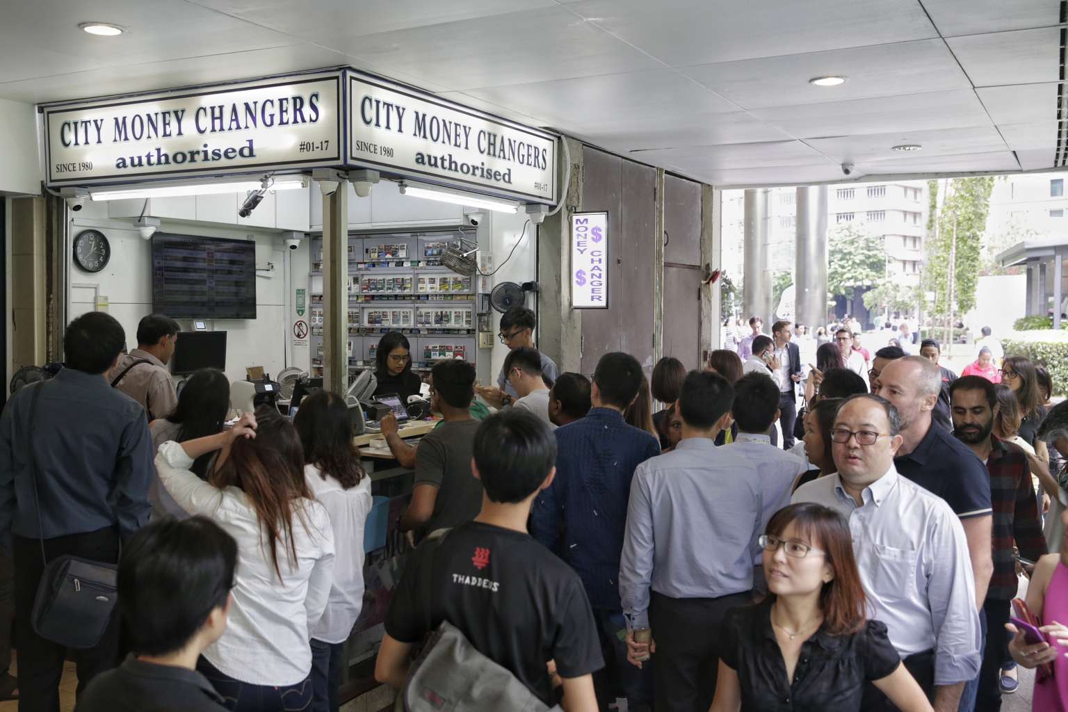 People checking the rates for the Sterling Pound at a money changer in The Arcade on June 24, 2016.