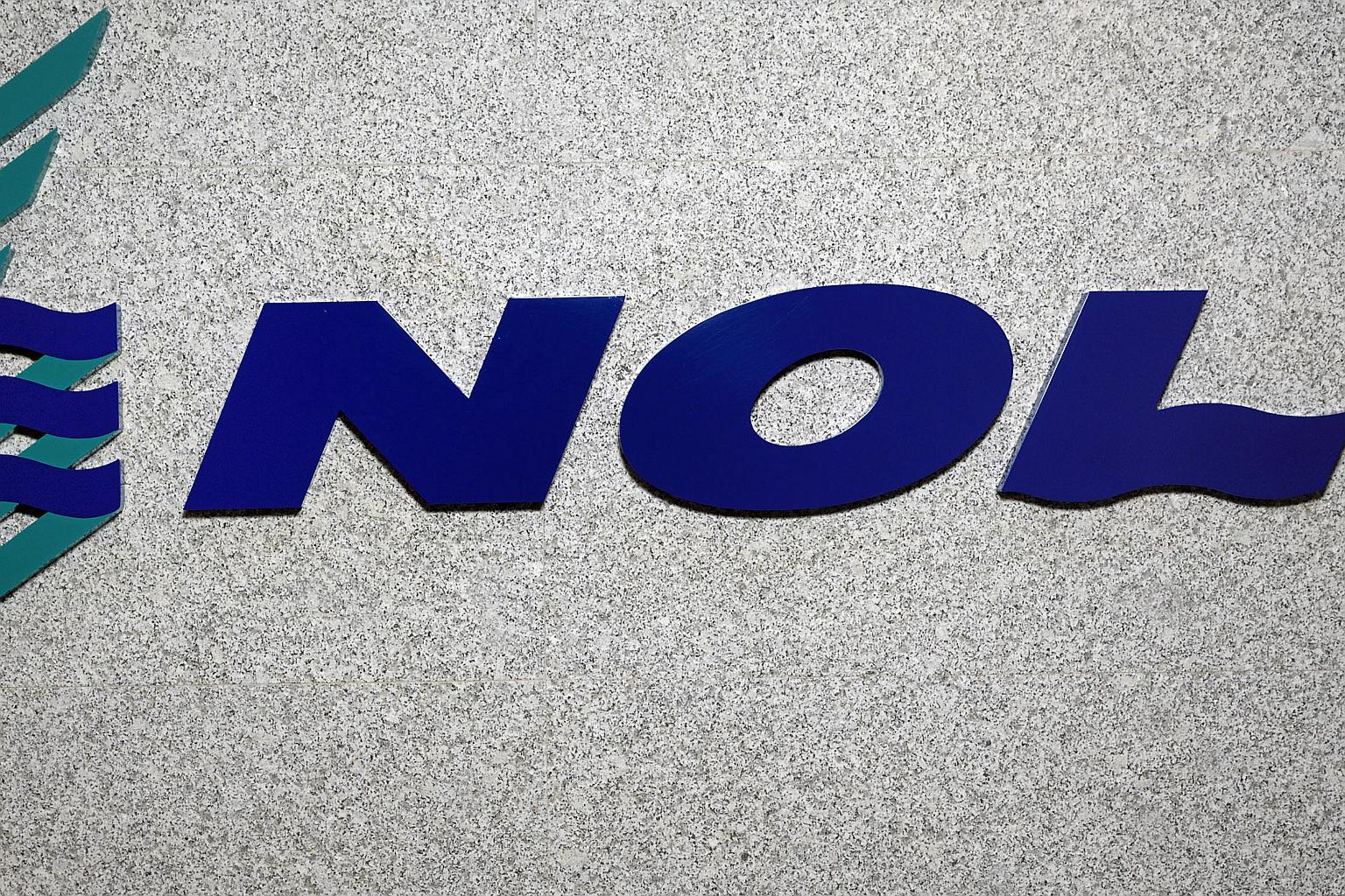 The logo of Neptune Orient Lines Ltd. (NOL) is displayed at the company headquarters in Singapore.