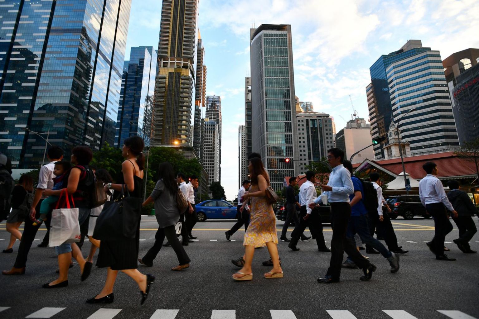 Pedestrians crossing the road along Shenton Way in Singapore's central business district.