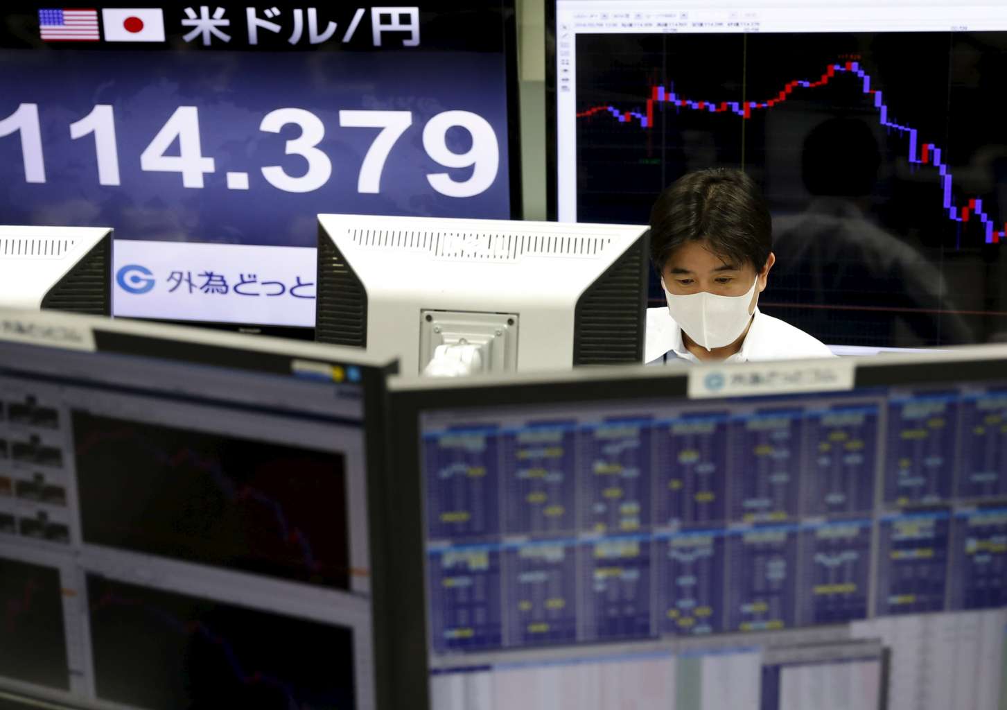 An employee of a foreign exchange trading company working in front of monitors displaying the Japanese yen's exchange rate against the US dollar in Tokyo, Japan, on Feb 9, 2016.