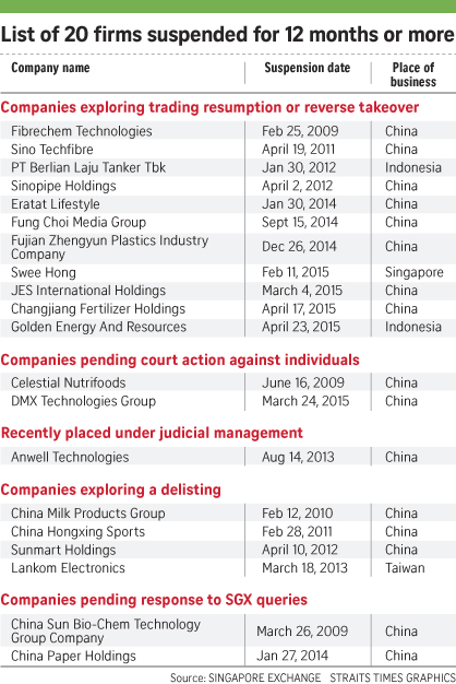 SGX listing compliance head June Sim said the shares of the 20 suspended firms combine only to roughly 0.3 per cent of total market cap, but the bourse is doing all it can to protect shareholders' interest.