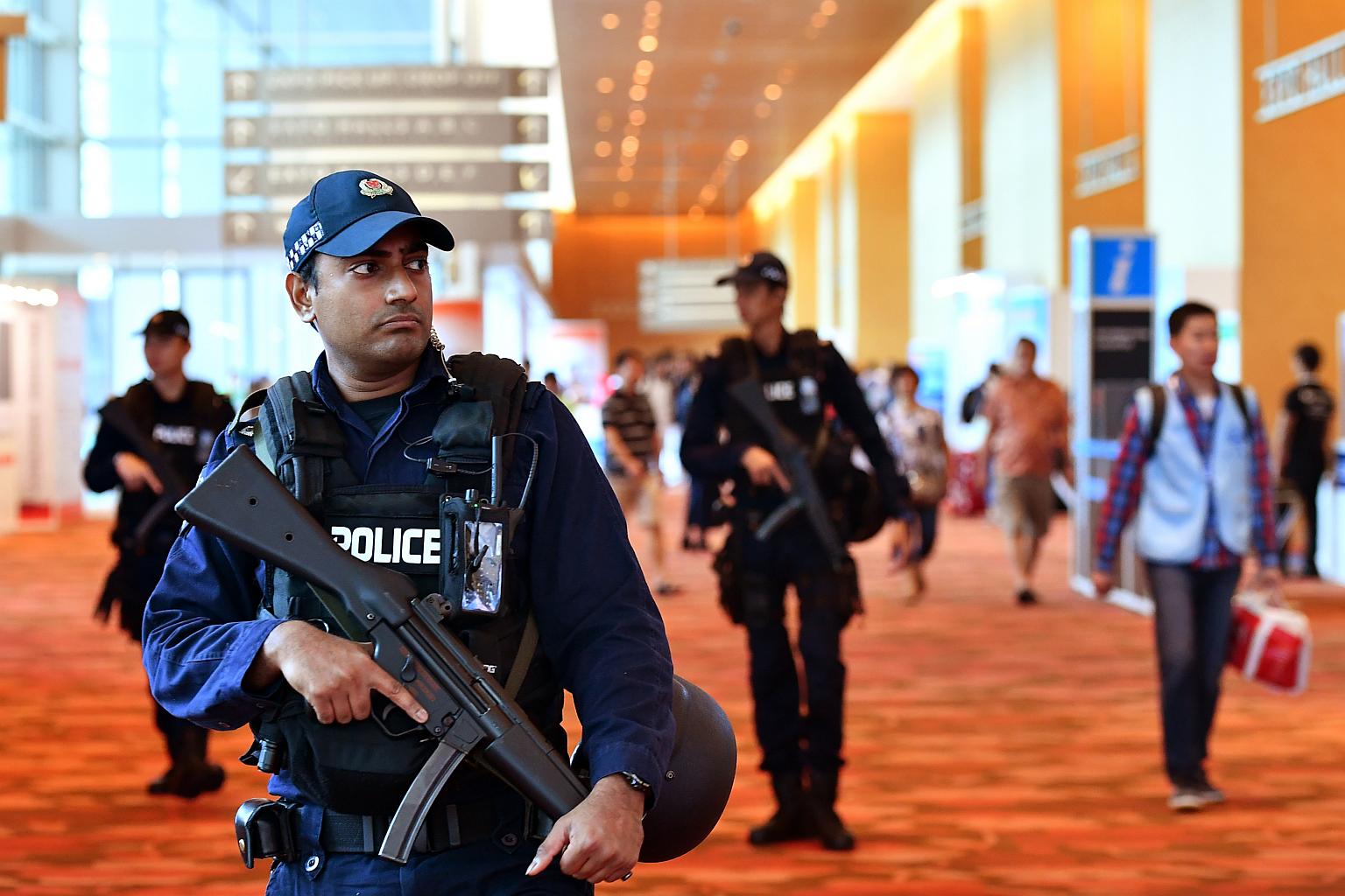 Security personnel patrolling the Marina Bay Sands Expo and Convention Centre area.