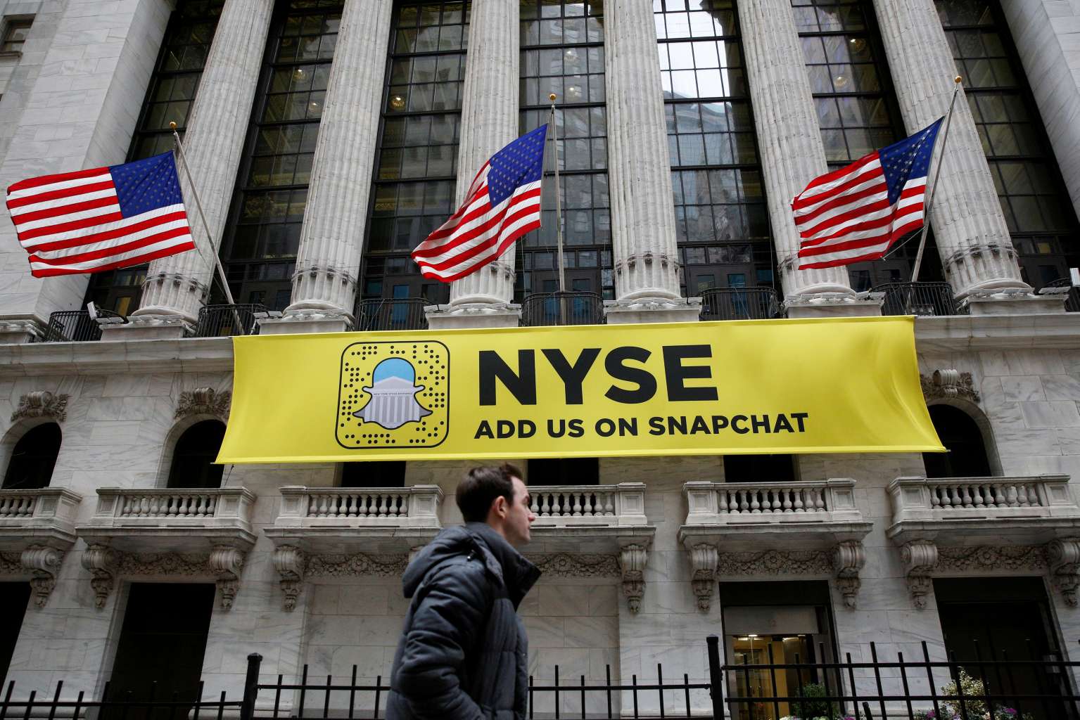 A Snapchat sign hangs on the facade of the New York Stock Exchange (NYSE) in New York City on Jan 23, 2017.