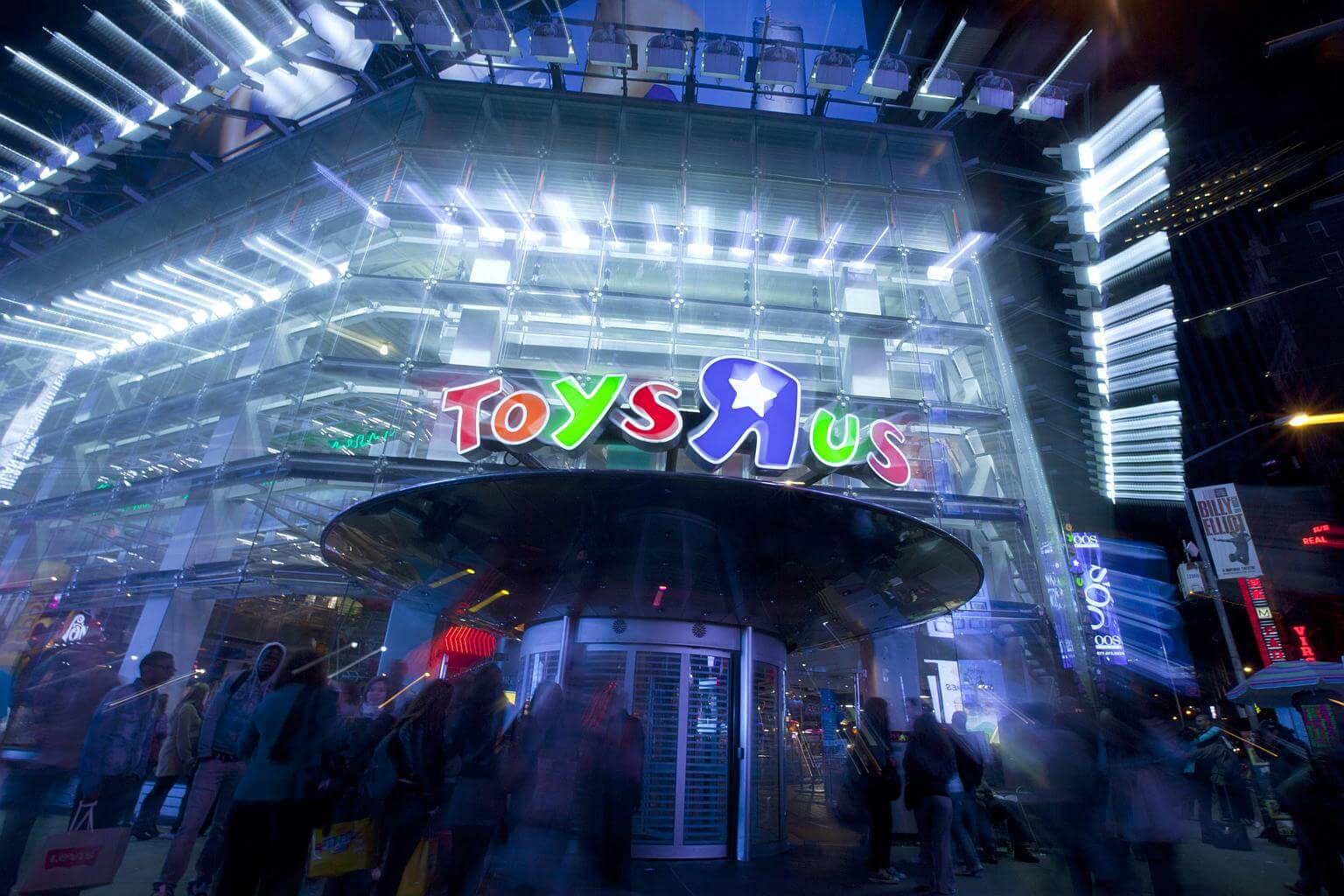 Pedestrians pass in front of Toy R Us' flagship store at Times Square in New York.