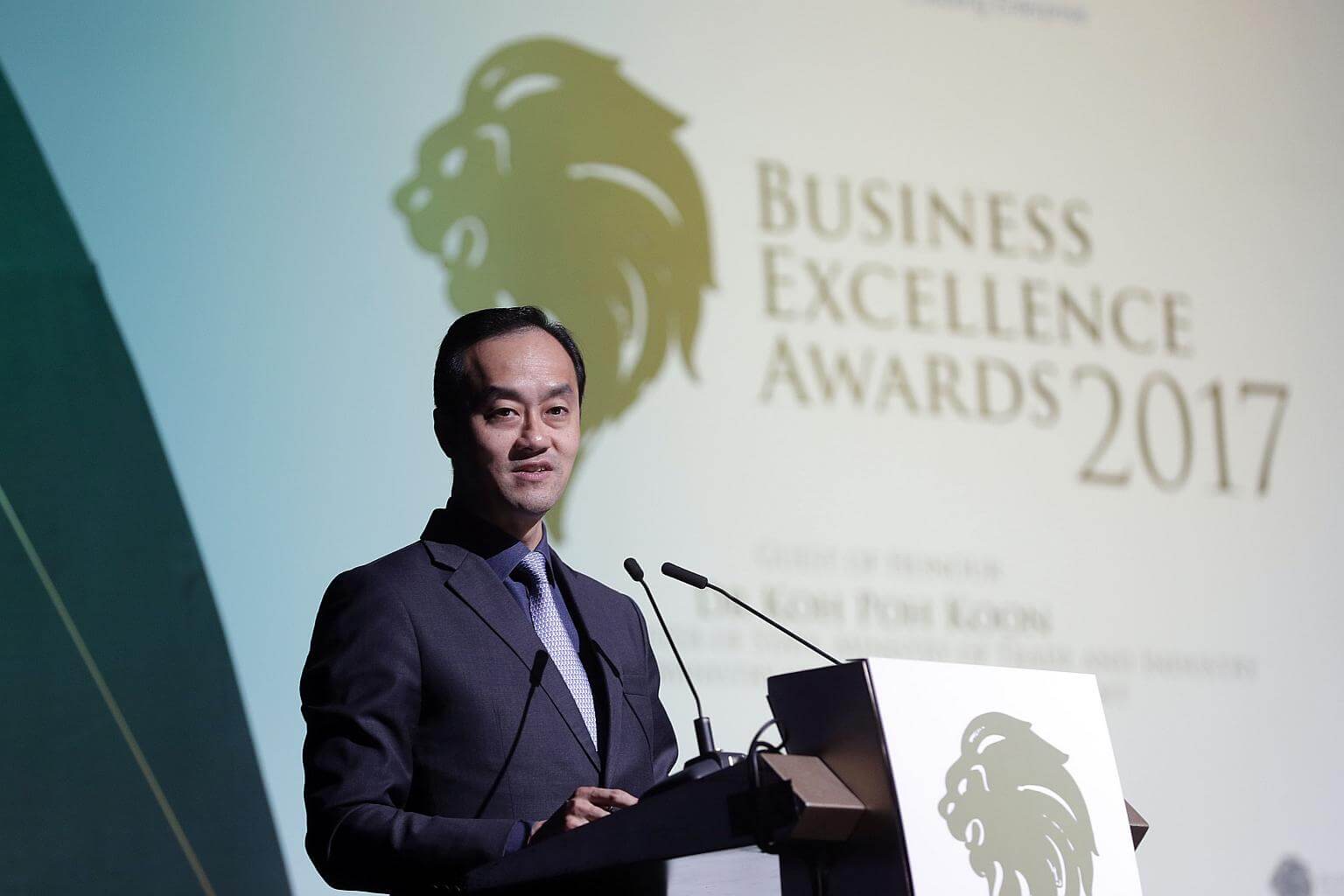 Senior Minister of State, Ministry of Trade and Industry and National Development Koh Poh Koon speaking at the Business Excellence Awards on Oct 26, 2017.