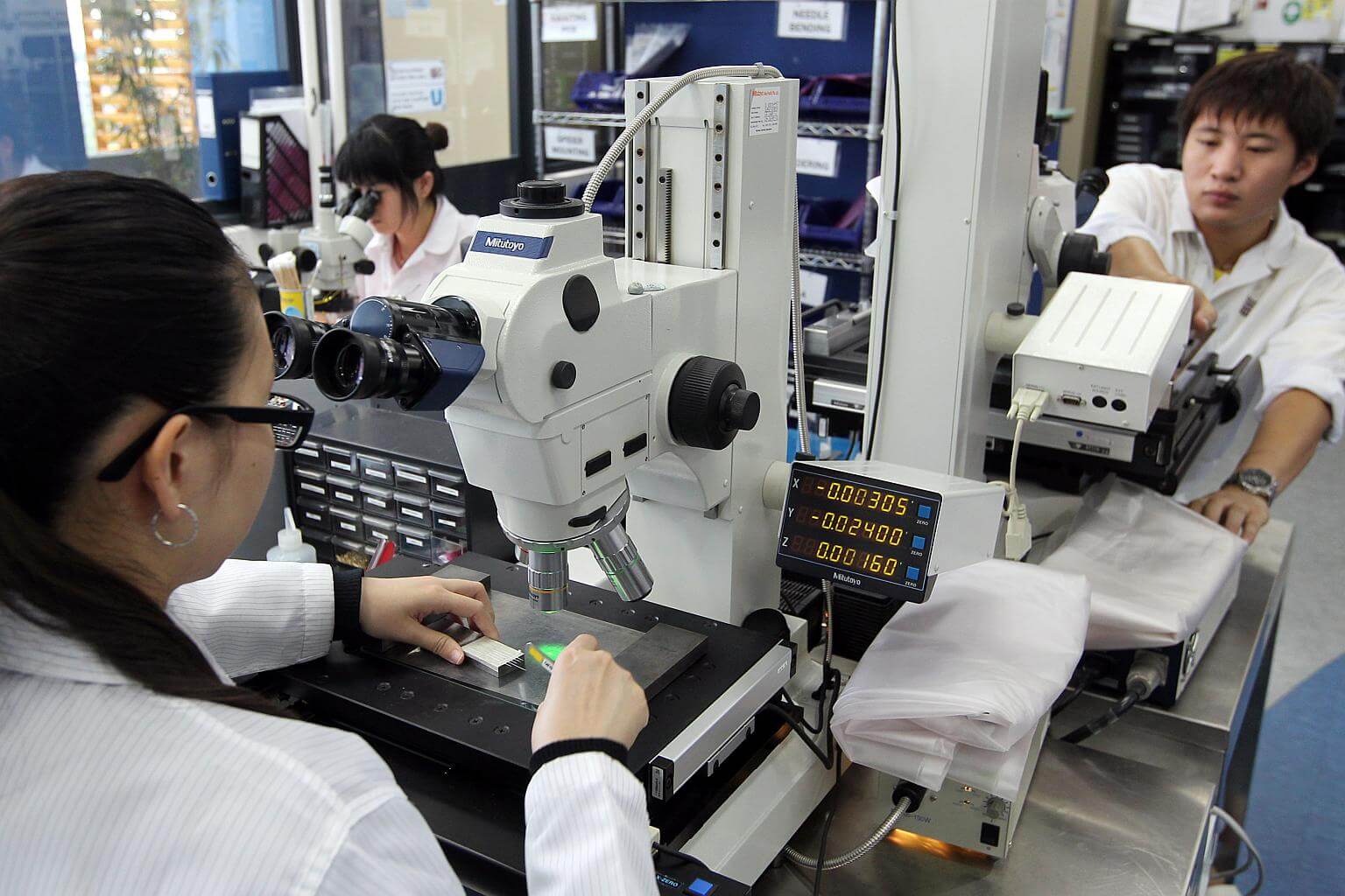 Staff of precision-engineering firm Feinmetall Singapore at work. The company received cash help from the Productivity and Innovation Credit scheme to upgrade software, train staff and purchase new equipment.