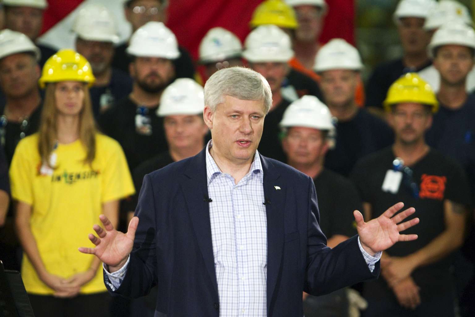 Canada's Prime Minister Stephen Harper speaking in the wake of data showing Canada slid into recession in the first half of the year, during a campaign stop in Burlington Ontario on Sept 1, 2015.
