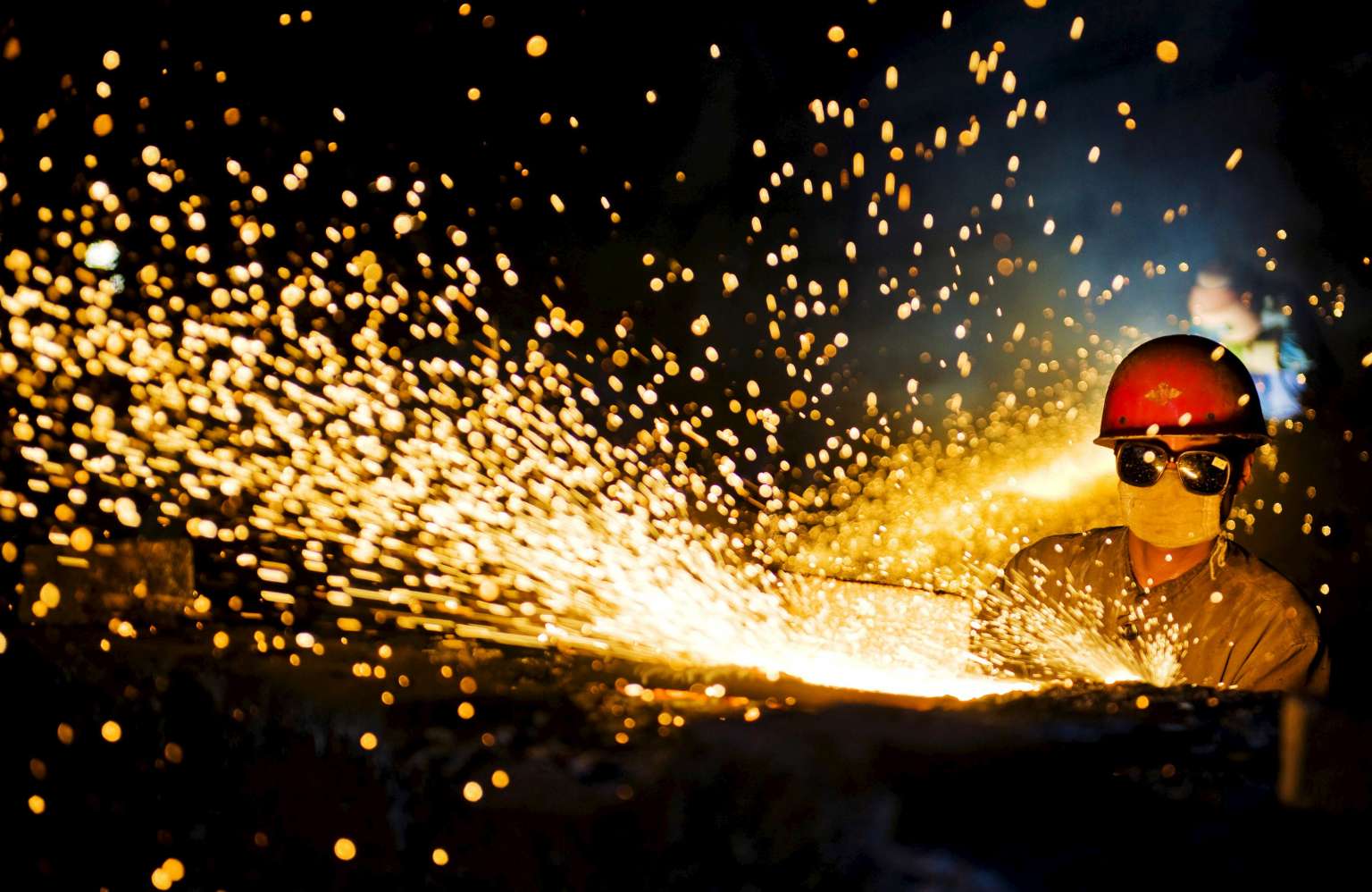 A worker wearing protective glasses welding steel products at a heavy equipment manufacturing factory in Luoyang, Henan province.