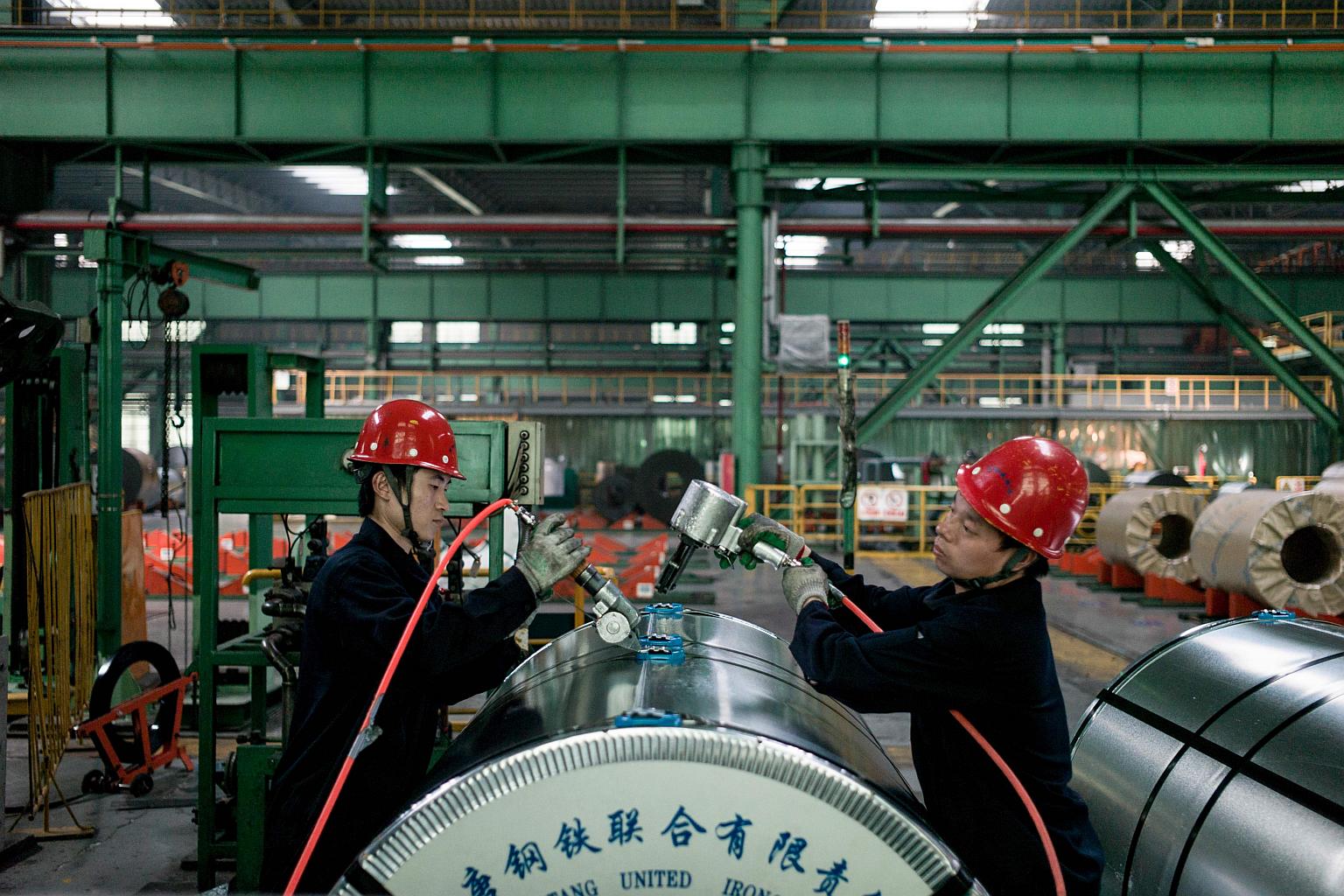 Chinese workers pack steel rolls in a steel factory in Tangshan.