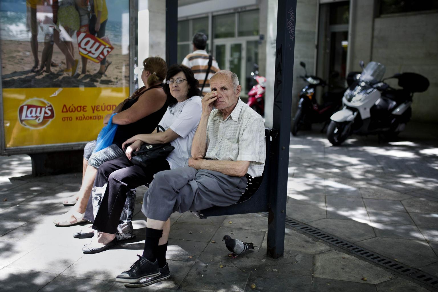 Residents wait for the bus in downtown Athens on June 30, 2015.