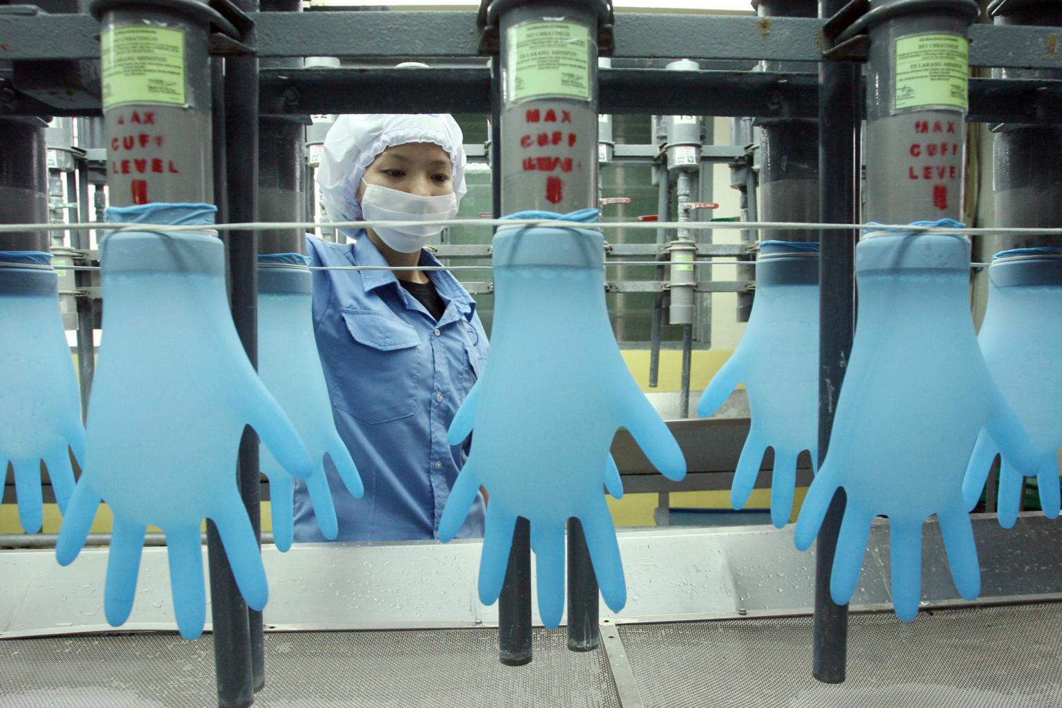 A worker conducting a quality check on rubber-gloves at the Top Glove rubber-glove factory in Klang, Selangor, on June 19, 2009.
