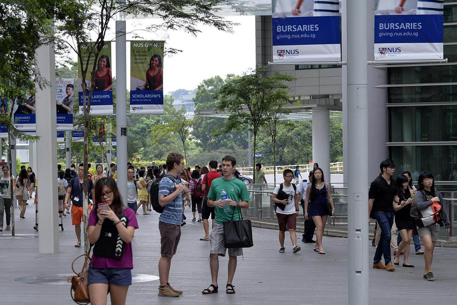 National University of Singapore (NUS) students walking in NUS University Town (UTown).