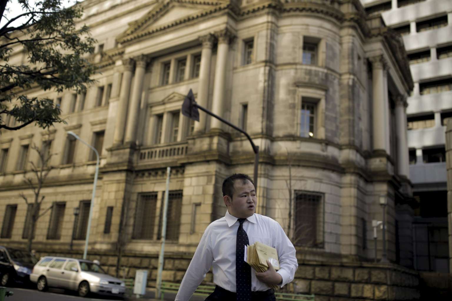A man crosses a street outside the headquarters of the Bank of Japan in Tokyo, Japan, on Feb 16, 2016.