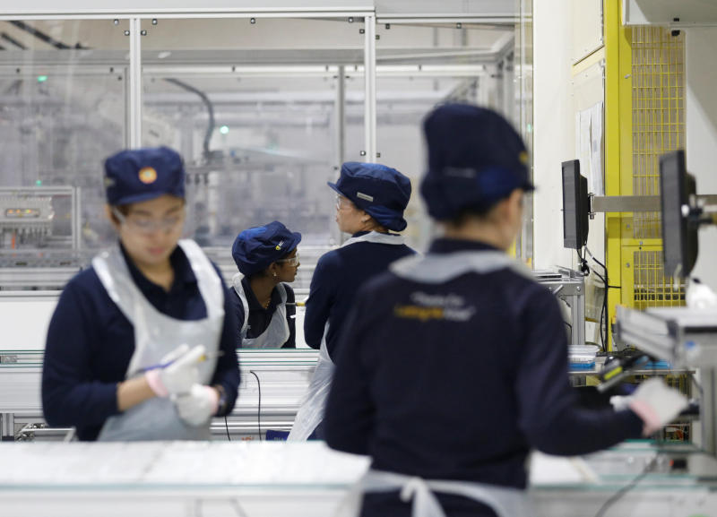 Employees work at a production line at an REC solar panel manufacturing plant in Singapore.
