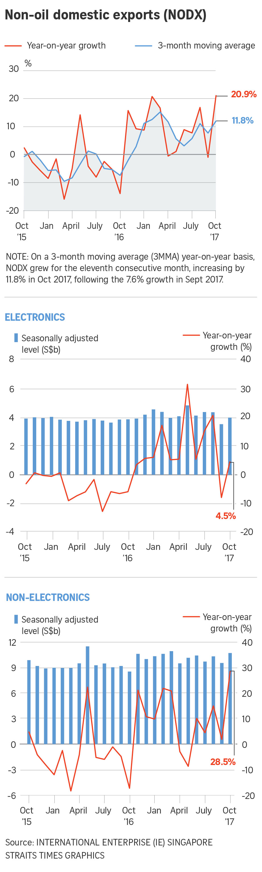 The rise in non-oil domestic exports (Nodx) blew past economist estimates of a 10 per cent expansion according to a Reuters poll of 11 analysts. It also made up for an unexpected 1.1 per cent decline in September following five straight months of growth, attributed mainly to a surprise drop in electronics shipments.