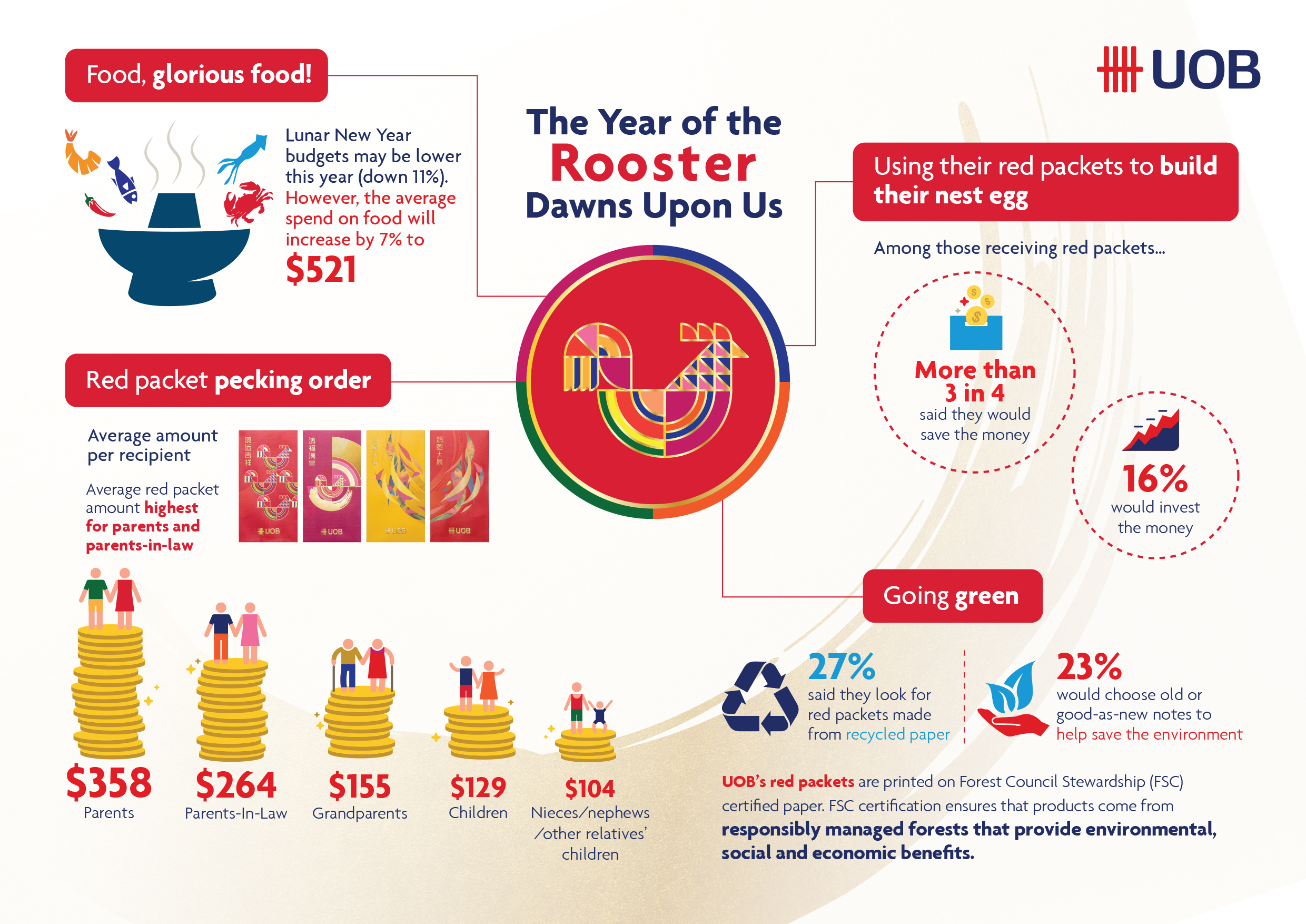 UOB said parents and parents-in-laws will receive the highest amounts in their red packets this year, at S$358 and S$264 respectively.