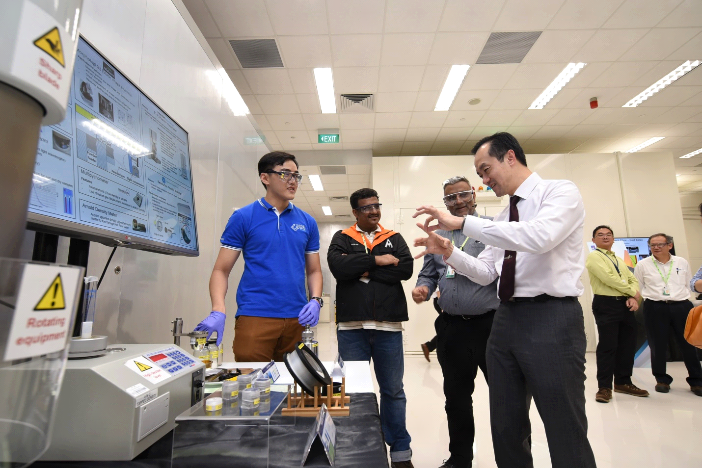 Senior Minister of State, Ministry of Trade & Industry and National Development Dr Koh Poh Koon (right) toured the Industrial Additive Manufacturing Facility (IAMF), and was briefed on the various additive manufacturing technologies made available at the Facility.