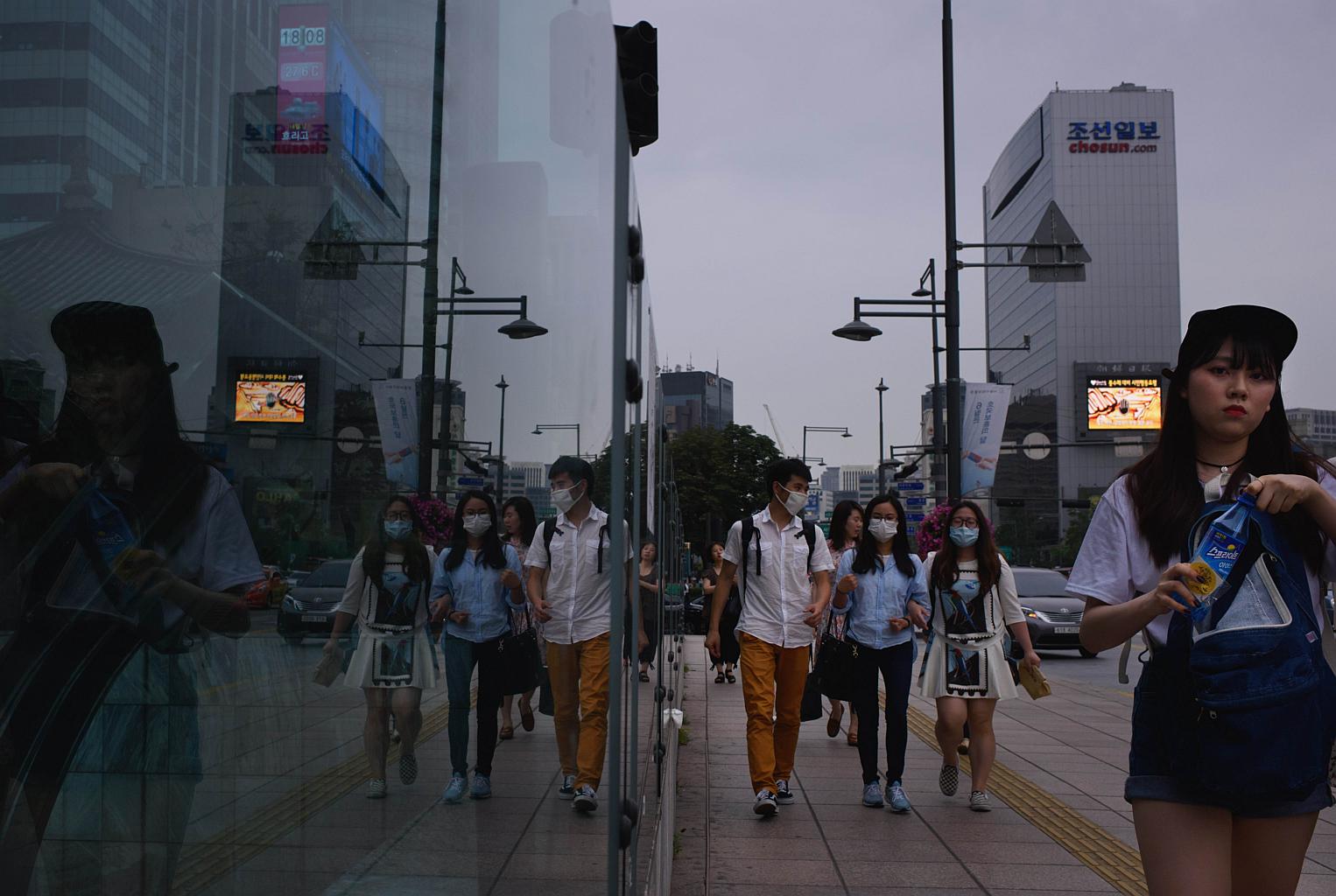 Pedestrians, some wearing face masks, in Seoul on June 25, 2015.