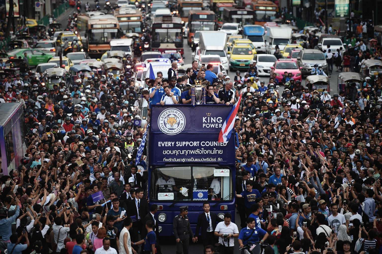Leicester City football players and staff stand with the Premier League trophy whilst surrounded by fans during the open-bus parade in Bangkok on May 19.