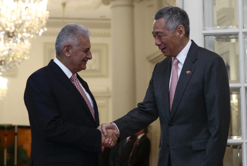 Turkish Prime Minister Binali Yildirim (left) and Singapore's Prime Minister Lee Hsien Loong (right) shake hands at the Istana Presidential Palace in Singapore on Aug 21, 2017.