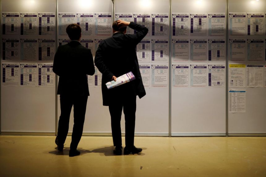 Men looking at recruiting information during a job fair in Seoul, South Korea, on April 12, 2017.