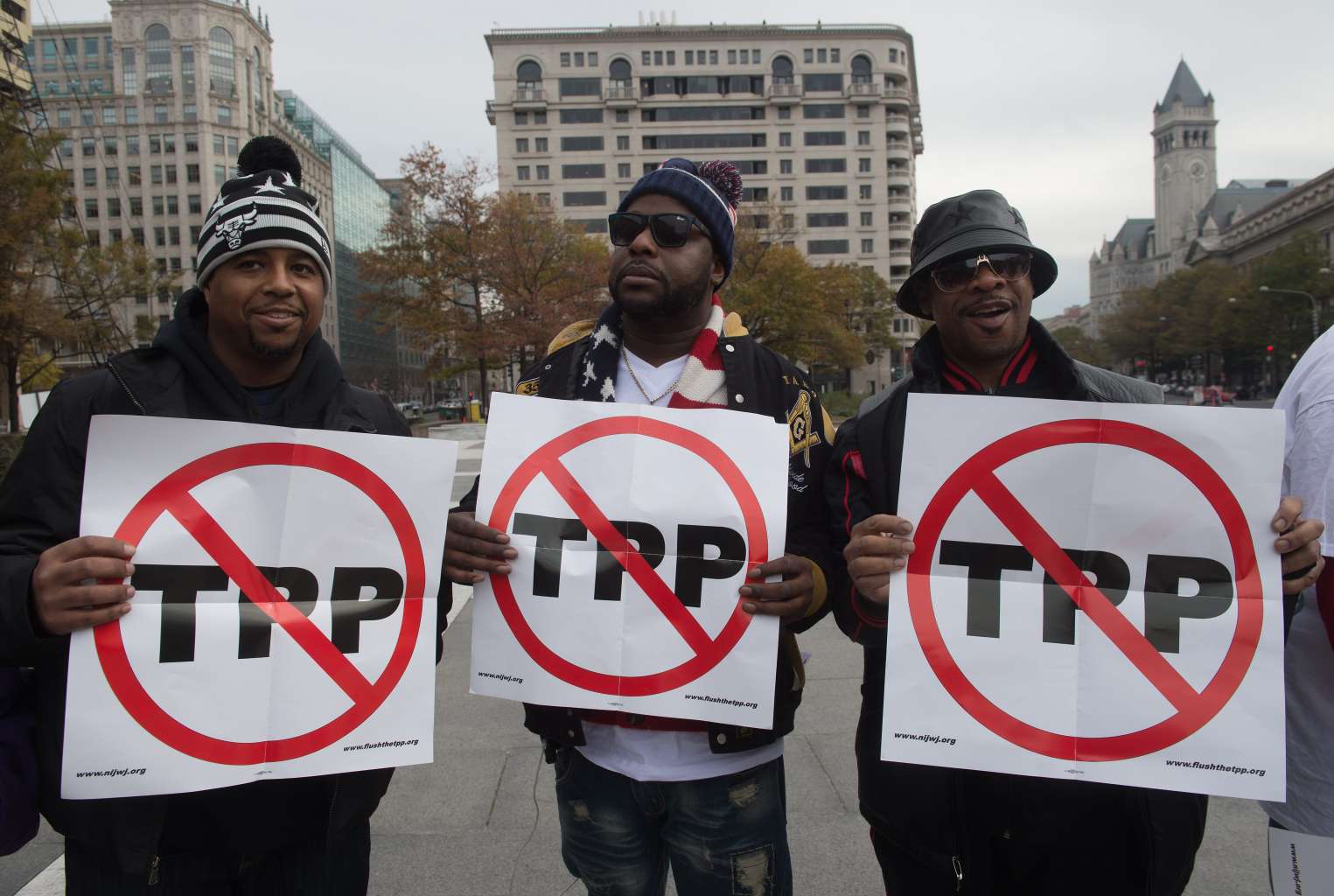 Men hold signs as they protest against the Trans-Pacific Partnership (TPP) trade agreement in Washington, DC in November 2016.
