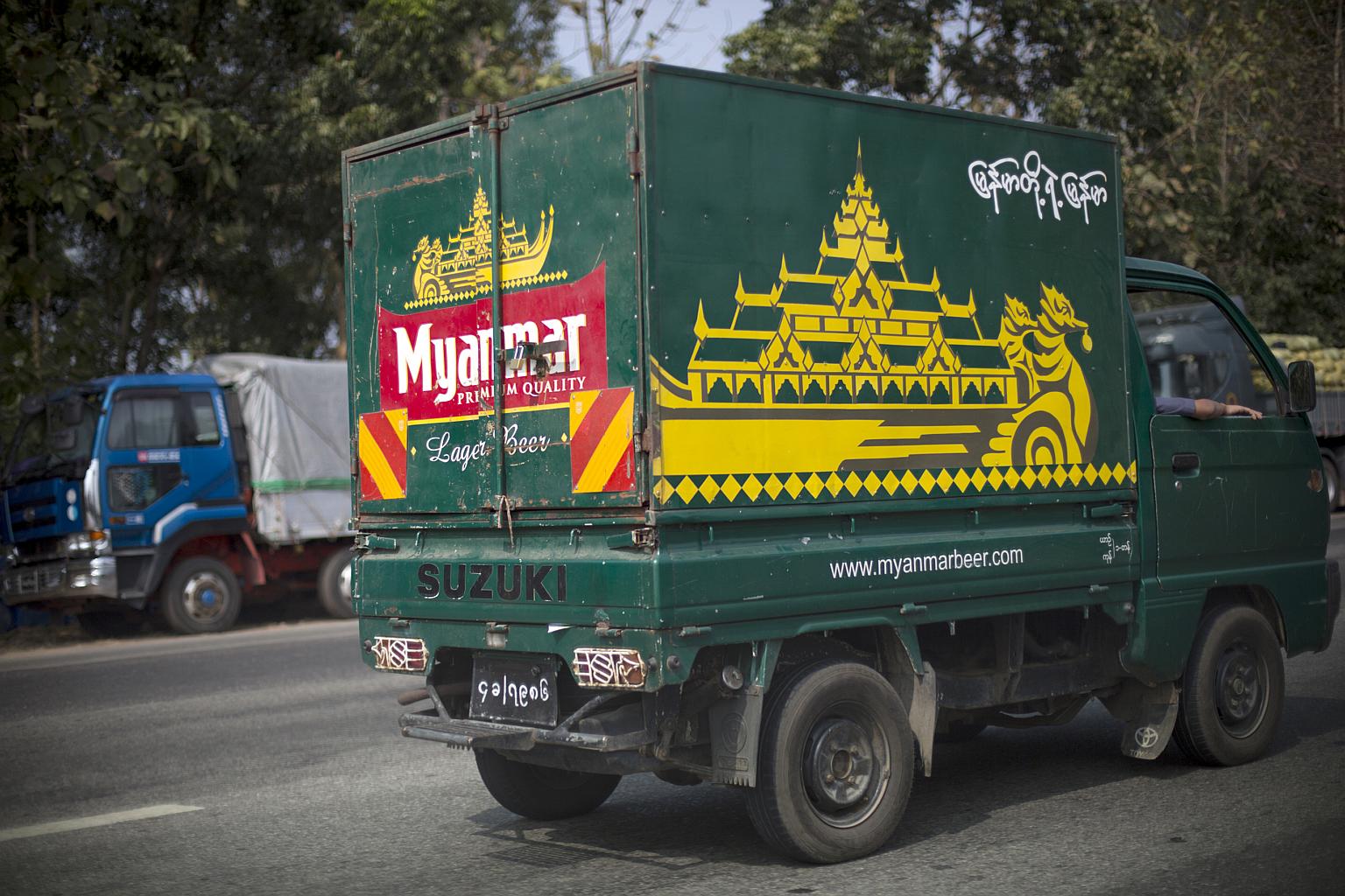 A Myanmar Beer truck driving along a road in Yangon, Myanmar.