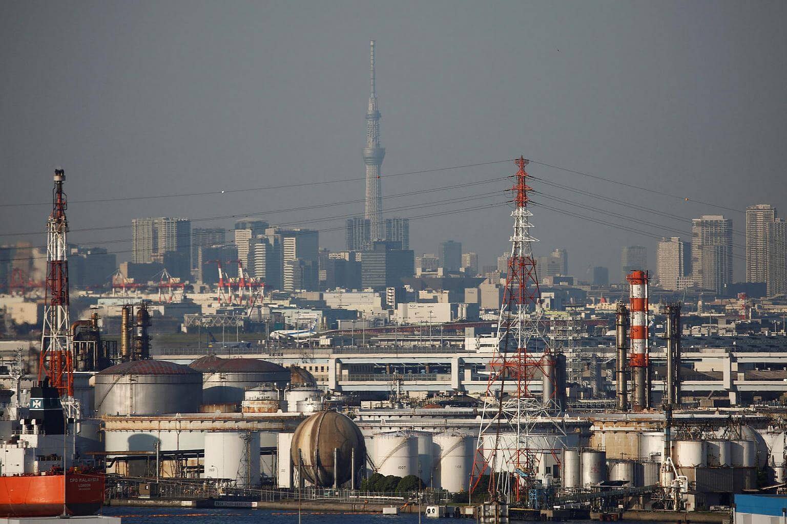 Chimneys of an industrial complex and Tokyo's skyline are seen from an observatory deck at an industrial port in Kawasaki, Japan, on Oct 24, 2016.