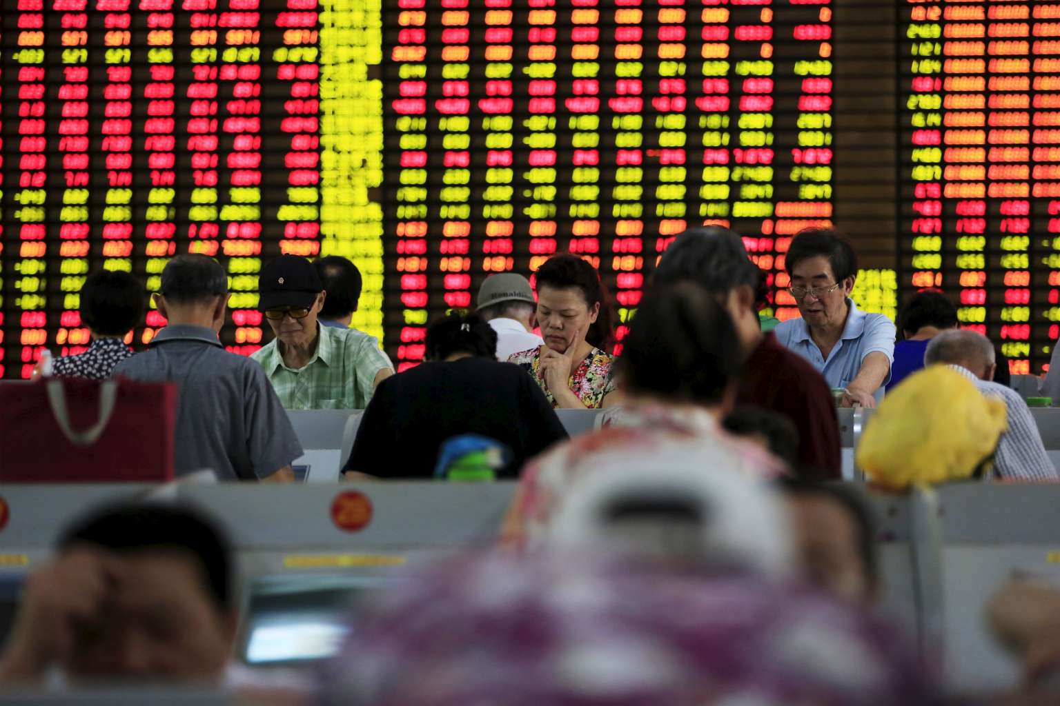 Investors looking at computer screens showing stock information at a brokerage in Shanghai, China.