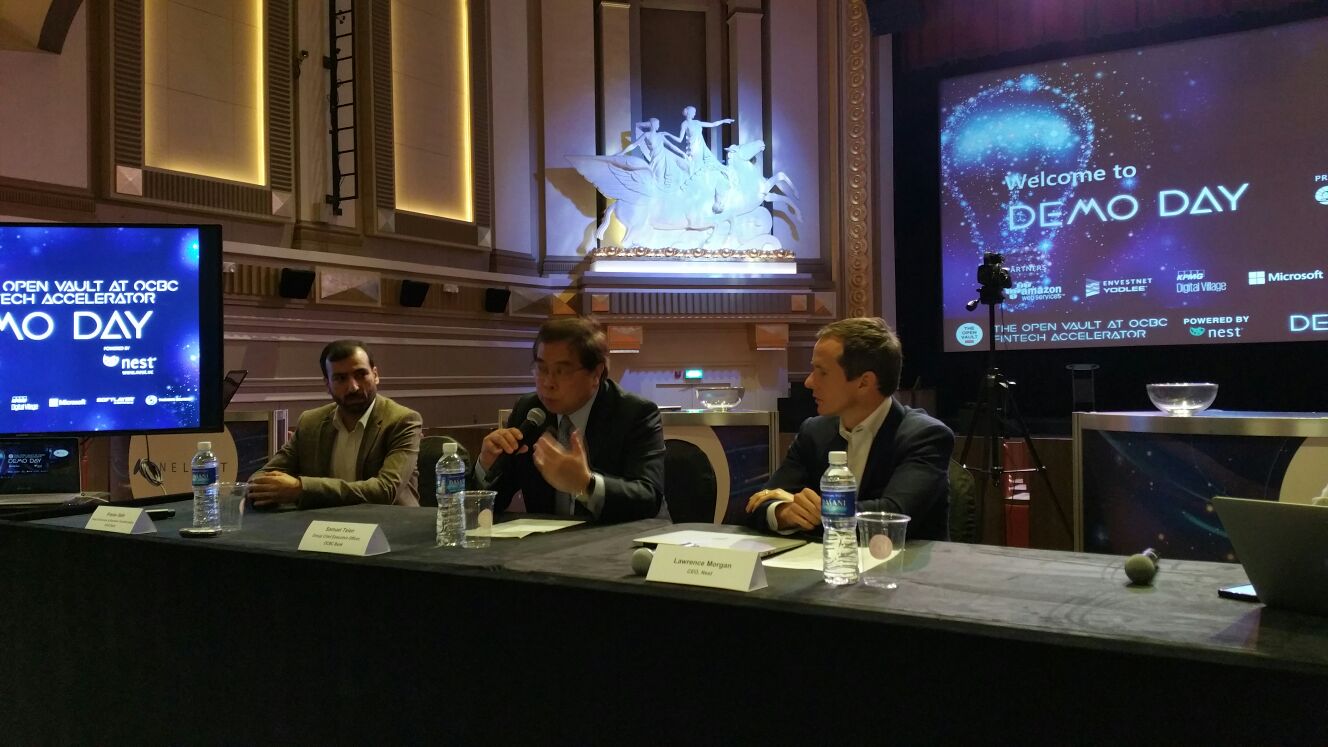 (From left) Pranav Seth, OCBC E-business and business transformation head; Samuel Tsien, OCBC CEO; Lawrence Morgan, CEO of Nest, a OCBC partner for the accelerator programme.