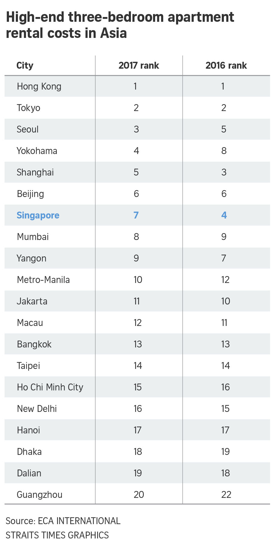 SINGAPORE - Singapore is the 7th most expensive location in Asia for high-end rental homes this year, falling from 4th position last year.