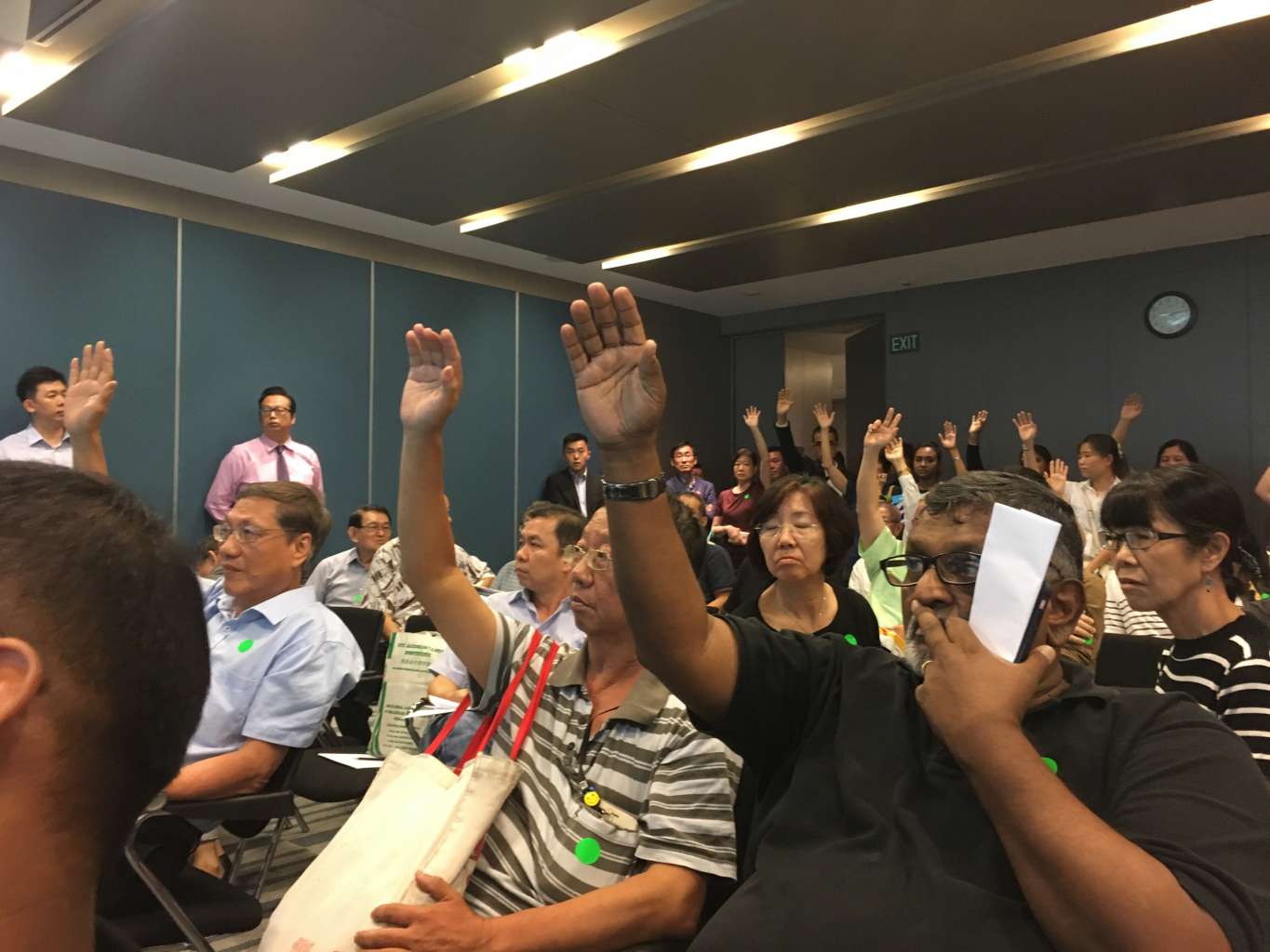 Shareholders and proxy holders of International Healthway Corp voting by a show of hands to adjourn the meeting, held at Maxwell Chambers. The adjournment was voted down narrowly 63 to 58.