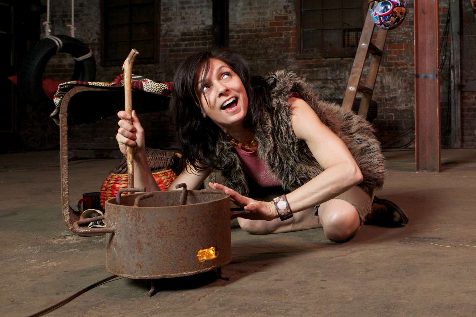 Props are perfect for a travelling show about living rough. A few branches and sticks of wood to mimic a campfire. A stick of chalk, a fur vest, a plastic hairbrush and other things that fit into a camping cooler. The problem is their place on the stage. The design of the Gallery Theatre ensures that any objects close to the front row are invisible to viewers in rows four and above. Several parts of Kidd's sketches are irritatingly obscured.