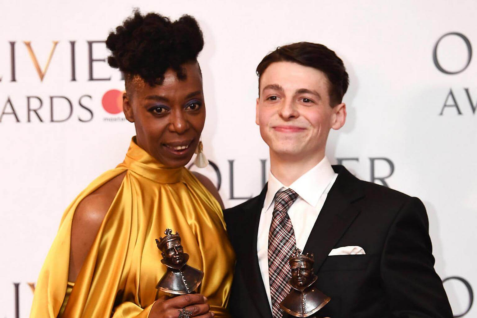 Noma Dumezweni, winner of Best Actress in Supporting Role for Harry Potter And The Cursed Child and Anthony Boyle, winner of the Best Actor in a Supporting Role award for Harry Potter And The Cursed with their awards during the 2017 Laurence Olivier Awards in London on April 9, 2017.