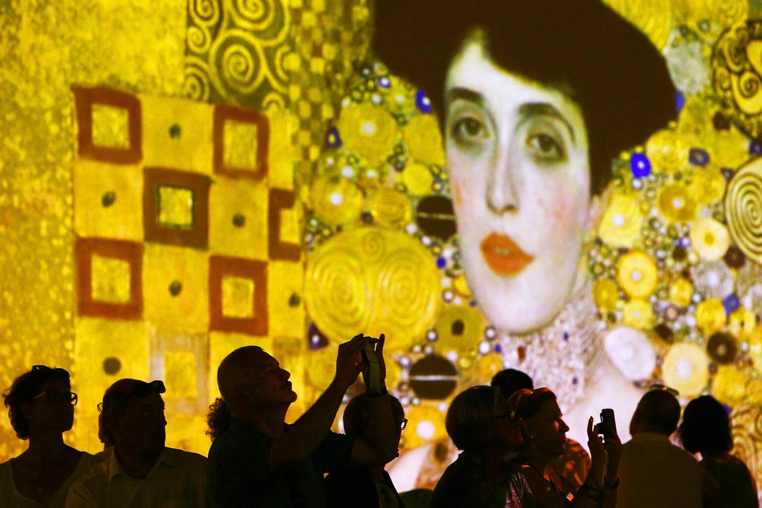A detail of Portrait of Adele Bloch-Bauer is displayed at the Klimt Experience exhibition on the life and work of Austrian painter Gustav Klimt (1862-1918) at the Museo delle Culture (Museum of Culture) in Milan, on July 29, 2017.