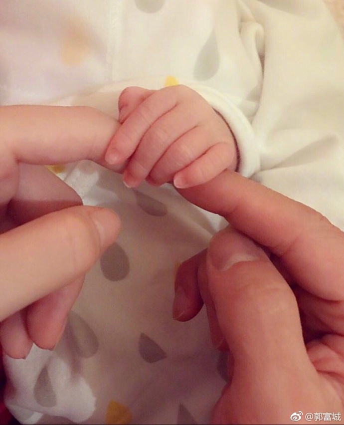 At 10.56am, the pop star posted a picture on Weibo of a baby's hand holding on to two fingers and wrote: "Happy, amazing, grateful! Us three! (two smiley faces, baby emoji) Grow, family, protect! (three smiley faces)"