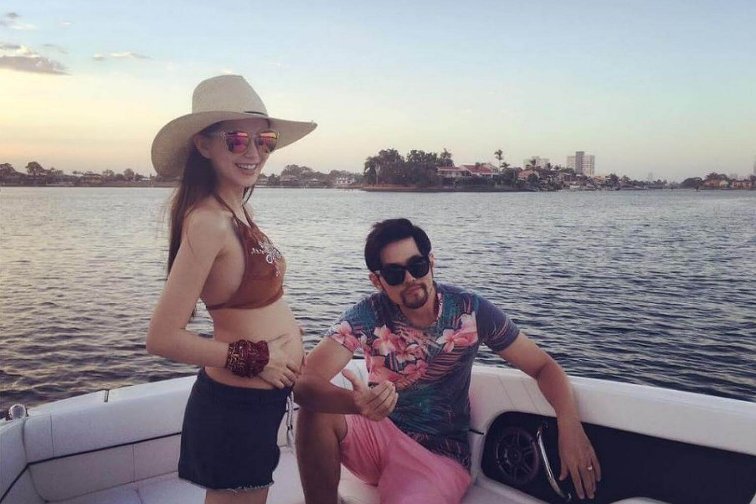 The picture (right) shared on social media shows Chou, 38, and Quinlivan, 23, on a boat. She is sporting a bikini and a baby bump.