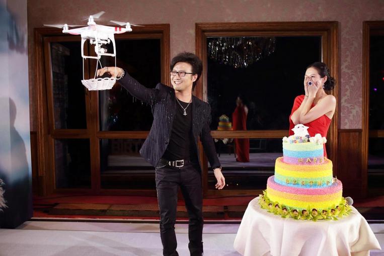 Wang Feng (left) reaching for the diamond ring carried by the drone.