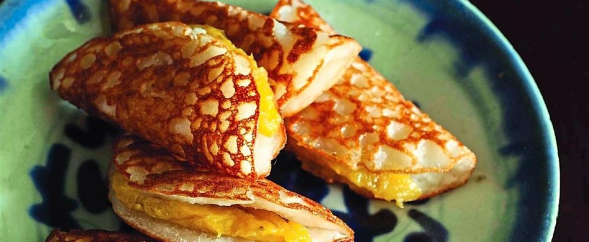 3. To make roti jala: Heat a non-stick pan. Grease pan with paper towel dipped in oil. Place roti jala cup over a bowl to collect the drippings. Ladle batter into cup to ¾ full. Hold bowl with one hand and cup with the other hand. Move bowl and cup over pan. Move cup over pan, making circular or figure eight patterns to form a lacy crepe of about 20cm diameter. Return the cup to the bowl once you have a lacy crepe.