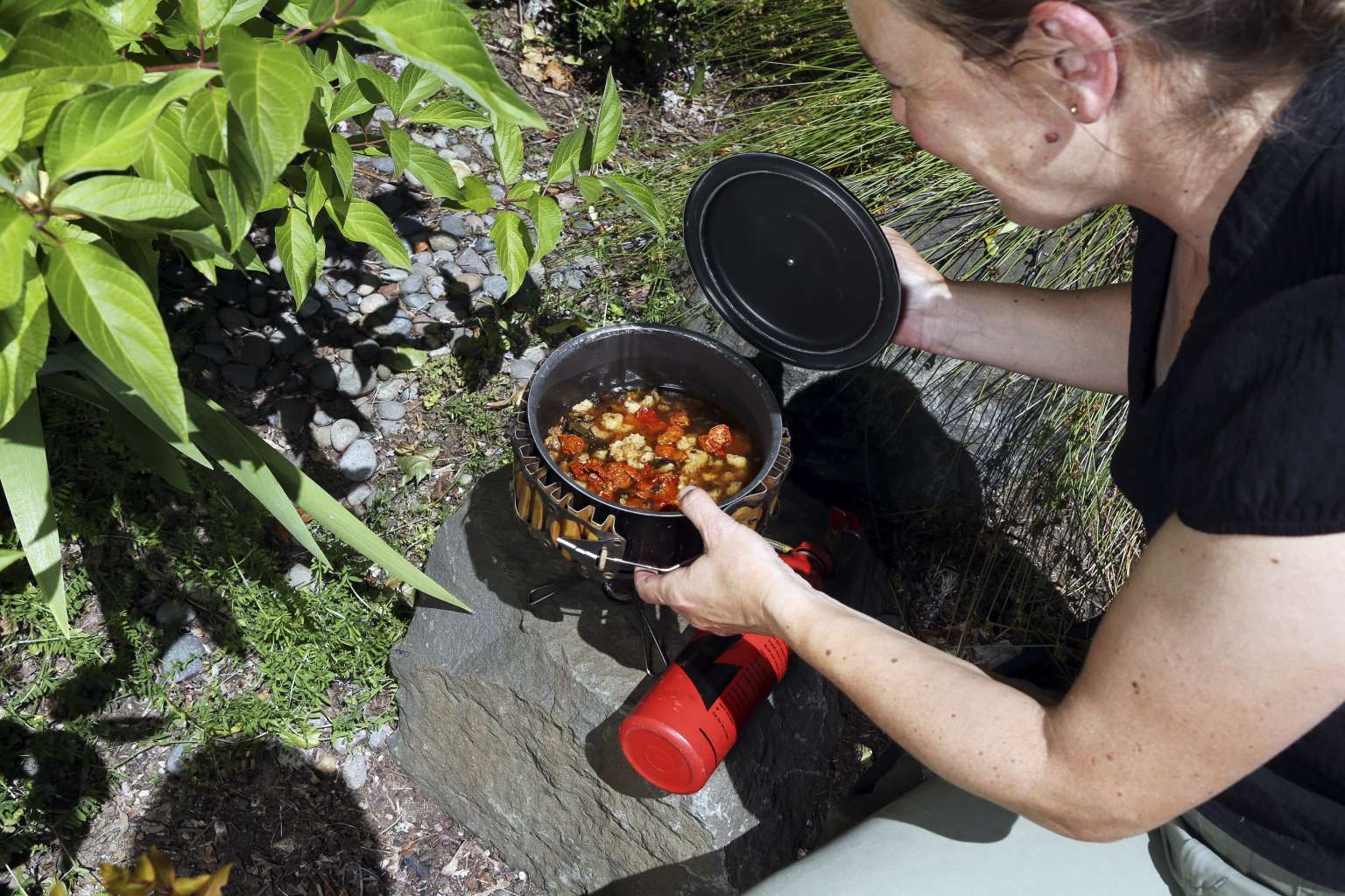 Laura Ohm heats up lamb bolognese, which was prepared at home, dehydrated and vacuum-sealed before a camping trip, in Portland, Oregon. PHOTO: NYTIMES
